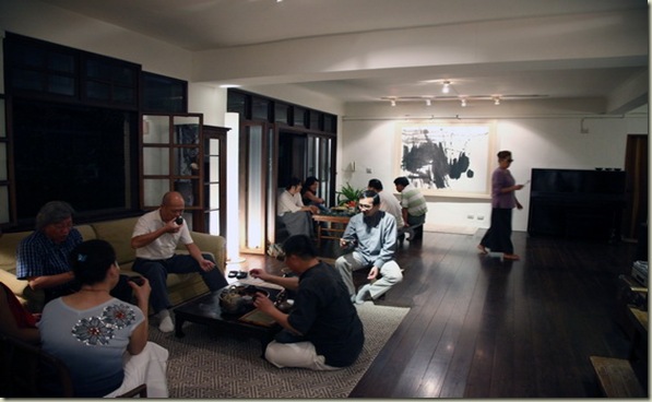 蓮花,我的一位年輕友人,有一個美美輕柔的名字,人如其名,是個策展人,認識了幾年,也因此讓我跟一些藝術界的朋友有了接觸;經其邀約,而有了今天的異遇。六月六日的午後,襖熱的天空容易使人不耐,信步走在台北市新生南路的某條有著古老磚牆,也靜謐,有著苦楝樹的巷弄裡,尋找一場當代的際遇。 那是一幢50~60年代傳統的「販厝」,磚造4樓,大門進入就看見直挺挺的樓梯,不過還是乾淨,往上轉兩個彎,梯轉處有盆夏荷迎來,暢快心情油然而生,尋梯再上一階,突見木板棧道引領進入區門,小心翼翼探頭內望,一驚,宅內景色有著東籬歸隱之境,興奮之際,腳下顛躓了一下。進得屋內,赤腳踩在深暗的木質地板上,柔弱的燈,低低的細語聲,合著牆上不刻意的作品,當代印象的線條變的是那麼的自在而不突兀,畫已經不是個作品了,她是這宅落裡的一部分,人,也不是過客,是這裡的主人了。 喝好茶,品糕點,識好友,聊天敘地,民歌低唱,今天,時間之神忘了他的節奏。